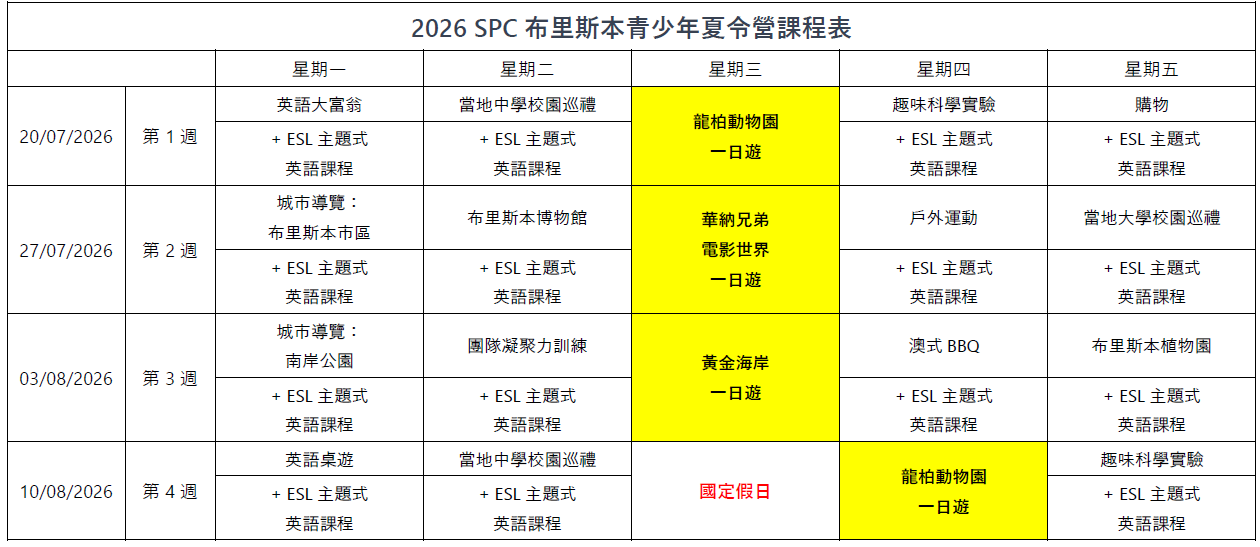 學校安排布里斯本校區的學生進行風光遊覽、公園做遊戲、電影欣賞、研究活動、植物園、澳洲原住民繪畫藝術欣賞、烤肉、藝廊參訪、杯子蛋糕裝飾、購物、大學參訪、保齡球。周末會去黃金海岸的電影世界、夢幻世界以及布里斯本龍柏公園。而黃金海岸校區行程包含黃金海岸風光遊覽、時間藝廊、黃金海岸歷史、桌遊、舞蹈、網球、爬蟲類動物園參訪、水上鴨子車。周末會去黃金海岸的電影世界、夢幻世界及當地的野生動物園。
