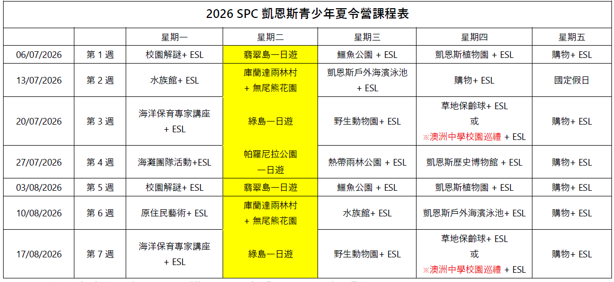 Imagine 2026年的寒假遊學主題為探索澳洲。早上上課,下午外出活動,會去黃金海岸或布里斯本一帶的博物館、遊樂園、參觀野生動物園、進行室內外體育活動或安排特殊課程,如: 烹飪課或文化講座。每週會有不同主題,帶孩子認識澳洲的人、城市和文化。每週安排星期二或三校外教學。